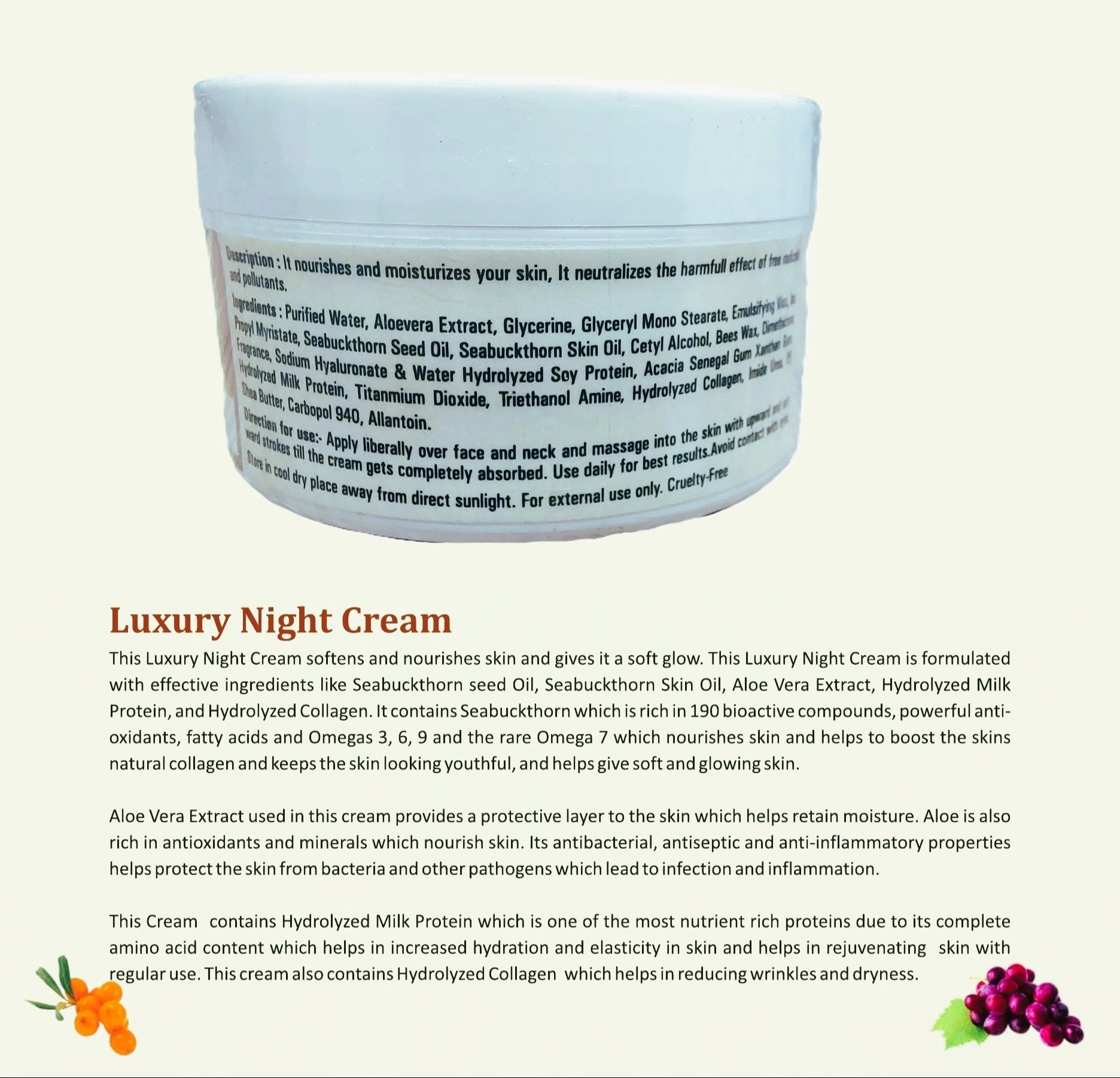 Ingredients: Purified Water, Aloe Vera Extract, Glycerine, Sea Buckthorn Seed & Skin Oils, Milk Protein, Collagen, Dimethicone, Beeswax, Emulsifiers, and more.
